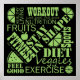 Decorative word cloud with fruit elements incorporated. A fun design to motivate fitness, healthy eating. Background colour is to be chosen.
