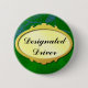 A Designated Driver button to promote safe holiday driving with no drunk drivers, this design has a golden label on a forest green background with a blue and green pine pattern.