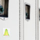 A pretty three tiered cake in lemon yellow with white polka dots and a long green ribbon.