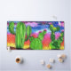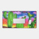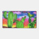 Brilliant colours of sunset on desert with cactus in the foreground. Artwork by Deanna Pendrick.
