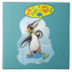 King penguin suffocating while strangled by six-pack plastic rings. It feels mad and complains by saying bad words as graphic signs in a bubble speech. A can of beer is thrown in the frozen ground