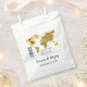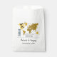 This design features a boarding pass theme. It showcases a gold map of the world along with two aeroplanes making a heart shape as they travel around the world. This destination themed wedding design is set out like a boarding pass with the date of the wedding personalised in the squares. A romantic destination design with an elegant touch. Ideal for a destination wedding no matter where in the world. The perfect all season travel wedding favour bag design. Matching wedding invitations and other stationery items are also available.