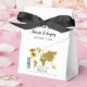 This design features a boarding pass theme. It showcases a gold map of the world along with two aeroplanes making a heart shape as they travel around the world. This destination themed wedding design is set out like a boarding pass with the date of the wedding personalised in the squares. A romantic destination design with an elegant touch. Ideal for a destination wedding no matter where in the world. The perfect all season travel wedding favour box design. Matching wedding invitations and other stationery items are also available.