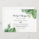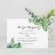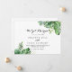 This destination tropical green calligraphy elopement announcement has a beautiful simple design. The design features hand-painted watercolor green palm and banana leaves neatly arranged into beautiful bouquets.