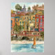 A beautiful watercolor and ink design created by the brilliant Melissa Wang, brought to you by World Art Group. In the foreground of this piece we can see a small sailboat just offshore a small beach populated by a number of items, people and palm trees. This scene could take place in somewhat a holy or religious city as the background and top tier is decorated with crucifixes or crosses towering over the foreground of the artwork. Perhaps this angle was an intentional perspective by the artist to signify the religious significance of this city.