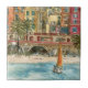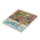 A beautiful watercolor and ink design created by the brilliant Melissa Wang, brought to you by World Art Group. In the foreground of this piece we can see a small sailboat just offshore a small beach populated by a number of items, people and palm trees. This scene could take place in somewhat a holy or religious city as the background and top tier is decorated with crucifixes or crosses towering over the foreground of the artwork. Perhaps this angle was an intentional perspective by the artist to signify the religious significance of this city.