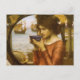 Destiny (1900) by JW Waterhouse is a vintage Victorian Pre-Raphaelite fine art portrait painting. A beautiful young woman is standing in front of a mirror drinking hot tea from a bowl. Boats can be seen in the harbour in the reflection in the mirror.