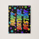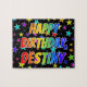 This exciting and fun birthday-themed jigsaw puzzle design has the message "HAPPY BIRTHDAY, DESTINY" with the characters having a colourful rainbow spectrum inspired gradient pattern, in addition to a vibrant field of stars background pattern. A colourful puzzle like this might be a fun way to send birthday wishes to somebody named Destiny. [~Z0000468]