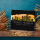 Tabletop plaque features Detroit Michigan city skyline silhouette with sunset coloured watercolor splash and latitude & longitude map coordinates, on black background