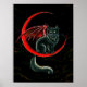 A black haired green eyed cat with bat wings on a harvest crescent moon.