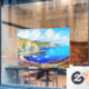 "Devon Harbour Dreamscape" – An English Seascape. A stylised watercolour of a radiant coastal vision where rolling green hills meet the sparkling blue waters of a peaceful harbour. Boats rest at anchor while whitewashed cottages with ochre roofs nestle against the landscape. Clouds bloom overhead like painted sculptures, and bright flowers in the foreground add vibrancy, creating a dreamlike celebration of the English seaside.