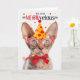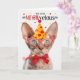This cute somewhat wrinkled Devon Rex with more fluff than hair looks cute in a party hat and matching accessories on this birthday card for the cat lover.
