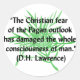 Text says: "The Christian fear of the Pagan Outlook has damaged the whole consciousness of man." D.H. Lawrence. Great t-shirt gift for Pagans, Wiccans and others who revere Nature.