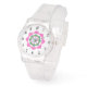 I only have one complaint. I ordered the watch with clear case and strap, and what was sent was white case and strap. I'm going to keep it because 1) it looks very nice in white, and 2) it would take too long to get a replacement made and sent in time for my occasion. Aside from the mix up with the color, the watch does look very good in white. The purple dial is actually sparkly which did not show in the online images. That was a nice surprise. If you like Swatch watches this is very similar to those. It's 33.6mm in diameter, 10.5mm thick, and 40.6mm lug to lug. Stainless steel case back says 3ATM/30m WR, so no swimming or showering or submerging this one. If you like Woodstock, this is a great choice.