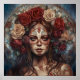 Featuring a beautiful portrait of a women with sugar skull makeup, dark hair and red roses.