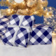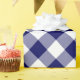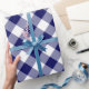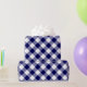 Stylish wrapping paper features dark blue, white, and light blue diamonds in a bold checked plaid. The diagonal navy and white gingham pattern was made from scratch.