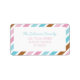 Colourful address labels design, by red_dress, featuring diagonal stripes printed on a white background. The stripes pattern features blue, pink and brown stripes and a white background, with rounded corners, with room for your text.
