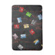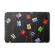 The artwork on this Bath Mat is an original graphic pattern by HomeWare of old fashioned telephones, the rotary dial styles used before push buttons and cell phones existed. Originally they were always black. But then things became exciting when phones came in colours like light blue, gold, green, white, and red for emergencies! The old phones plugged in with spiral cords that stretched, represented by the red zigzag lines in the pattern being stretched to the max. The background is a black texture with flecks of colour, like the faux marble patterns on the modern material of the 1950s, linoleum. The rotary dials had all the numbers and symbols, but the number 9 in the graphic is the number to dial for an outside line in large companies.