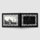 Elegant faux diamond look shapes and diamond heart-shaped faux gemstones on a black background with silver foil text 60th Wedding Anniversary design. Back features a repeat of the faux diamond frame over a photo of the couple. Original design by Holiday Hearts Designs (rights reserved).