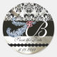 DIAMOND FEATHERS WHITE BLACK SILK DAMASK MONOGRAM CLASSIC ROUND STICKER
