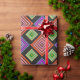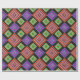 This wrapping paper has a geometric design of concentric diamonds in orange and pink, blue and purple, and yellow and green, on a black background.