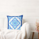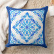 This beautiful pillow features a design that looks like a blue delft china tile. A blue border frames the pillow and the reverse side is a matching solid royal blue.