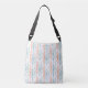 This crossbody tote bag has a mid-century modern design of vertical lines with diamonds and ovals in three different designs repeating across the design. If you like the design but prefer different colours, message me.
