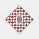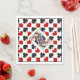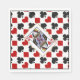 These are cute gift cocktail napkins for a variety of occasions, but especially card parties. They feature the familiar red, black, and white pattern of diamonds, hearts, spades and clubs commonly found in a deck of playing cards. The centre of each napkin has a gold frame around the winking Queen of Hearts.