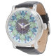 Vintage black leather strap watch with an image of a digital artwork created with images of diamond-shaped blue topaz and peridot gemstones, emerald triangles, pearls, and fiery opals in an ornate setting. See matching round button, round charm, large round premium metal keychain, round double-sided acrylic keychain, swirl keychain and round necklace. See the entire Gemstones & Medallions Watch collection in the ACCESSORIES section.