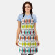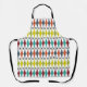 This apron has a mid-century modern design of stretched diamonds and starbursts on a field of white.