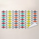 This towel set has a beet washcloth, a turquoise hand towel, and a bath towel with a mid-century modern design of stretched diamonds and starbursts on a field of white.