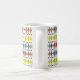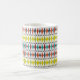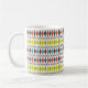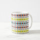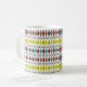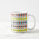 This mug has a mid-century modern design of stretched diamonds and starbursts on a field of white.