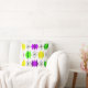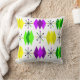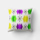 This throw pillow has a mid-century modern design of diamonds and starbursts in Mardi Gras colours of shades of purple, green, and yellow