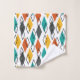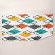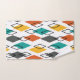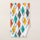 This towel set has a mid-century modern design of diamonds in orange, yellow, turquoise, grey, and outlined scattered throughout on a field of white.