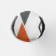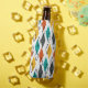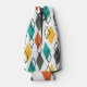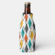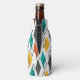 This bottle cooler has a mid-century modern design of diamonds in orange, yellow, turquoise, grey, and outlined scattered throughout on a field of white.
