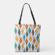 This tote bag has a mid-century modern design of diamonds scattered about in orange, gold, turquoise, grey, and outlines on a field of white