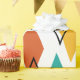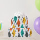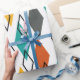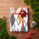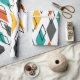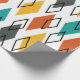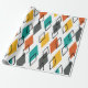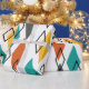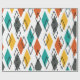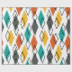 This wrapping paper has a mid-century modern design of diamonds scattered about in orange, gold, turquoise, grey, and outlines on a field of white