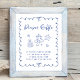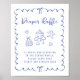 Cute diaper raffle drop off sign for your baby boy shower that features a french blue wavy frame adorned with bows, whimsical blue hand-drawn illustrations of hearts, stars, cake and nursery decor, and "Diaper Raffle" showcased in a fun blue script.