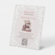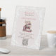 Have your guest contribute to a 'diaperfund' using your own donation page and a QR code. This sweet floral party sign is for a baby shower event, with the theme 'New chapter'. Features illustrations of a watercolor stack of floral decorated books and the background is light blush pink peonies in a soft colour. Classic old english text style font for a feeling of old kids illustration books.