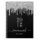 A chic black background with trendy faux silver glitter drips, paint dripping look. Personalise and add a name, your monogram letter and a title. The name is written with a large modern hand lettered style script with swashes. To keep the swashes only delete the sample name, leave the spaces or emoji's in front and after the name. White and grey text. Use it as a diary, journal, for taking notes, for school, work or your home office.