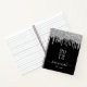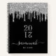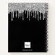A chic black background with trendy faux silver glitter drips, paint dripping look. Personalise and add a name, your monogram letter and a title. The name is written with a large modern hand lettered style script with swashes. To keep the swashes only delete the sample name, leave the spaces or emoji's in front and after the name. White and grey text. Use it as a diary, journal, for taking notes, for school, work or your home office.