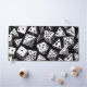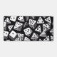 This dynamic digital artwork features an array of tumbling dice against a stark black background. The dice vary in shape and size, including traditional six-sided cubes and triangular four-sided forms. Each die is meticulously detailed, with sharp contrasts between the white surfaces and black pips, creating a striking visual effect. The chaotic yet harmonious arrangement of the dice evokes a sense of motion and randomness, making the piece both intriguing and playful.