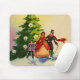 Old English Dickens style Christmas illustration with a family standing in the snow in front of a Christmas tree with candles.