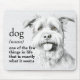 A dictionary definition for DOG in black text on a whitewashed wood background with a cute terrier sketch portrait
