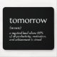 A dictionary definition of TOMORROW is in bold white text on a black background.