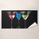 Different cocktails in martini glasses on black bath towel