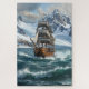 The image is a digital illustration of a sailing ship in the ocean. The ship is a tall ship with multiple masts and sails, and it appears to be sailing towards a mountainous landscape. The sky is overcast and the water is choppy, with small waves crashing around the ship. The mountains in the background are covered in snow and ice, and the overall mood of the image is dramatic and awe-inspiring. The colours are mostly muted, with some hints of blue and green, giving the impression of a cold and desolate landscape.