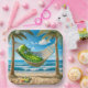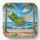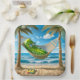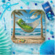 Big green dill pickle hanging between two tropical palm trees on a beach with flip-flops.