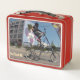 Portland tallbike clown and rock n roller on a metal lunchbox.