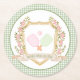 Impress your guests with these beautiful custom pickleball party drink coasters. These coasters have a watercolor image of a crest surrounded by floral branches with green and pink gingham pickleball paddles in the centre. There is a green gingham border around the edge with a coordinating pattern on the back. Text says "Dinks and Drinks." Colours used include moss green, blush pink and and tan.